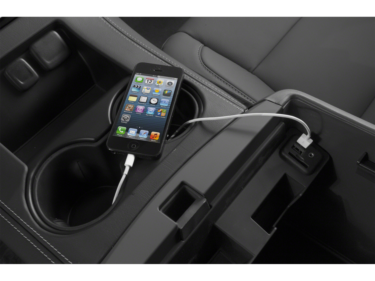 - Console, floor with storage area, cup holders, SD card slot and auxiliary jack